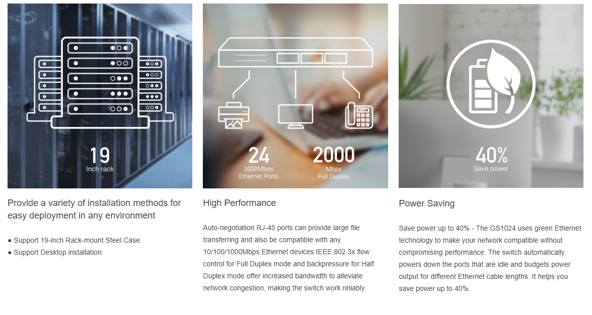 ● Суич GS1024 - 24x 10/100/1000 Mbps RJ45 порта с автоматично договаряне(разпознава скороста на включеното у-во), поддържащи Auto-MDI/MDIX(разпознава типа кабел)