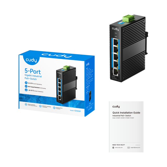 Cudy IG1005P е индустриален 5-портов гигабитен PoE+ суич, създаден за работа в тежки условия като производство, транспорт, морски и минни среди. Ето какво го прави толкова специален: