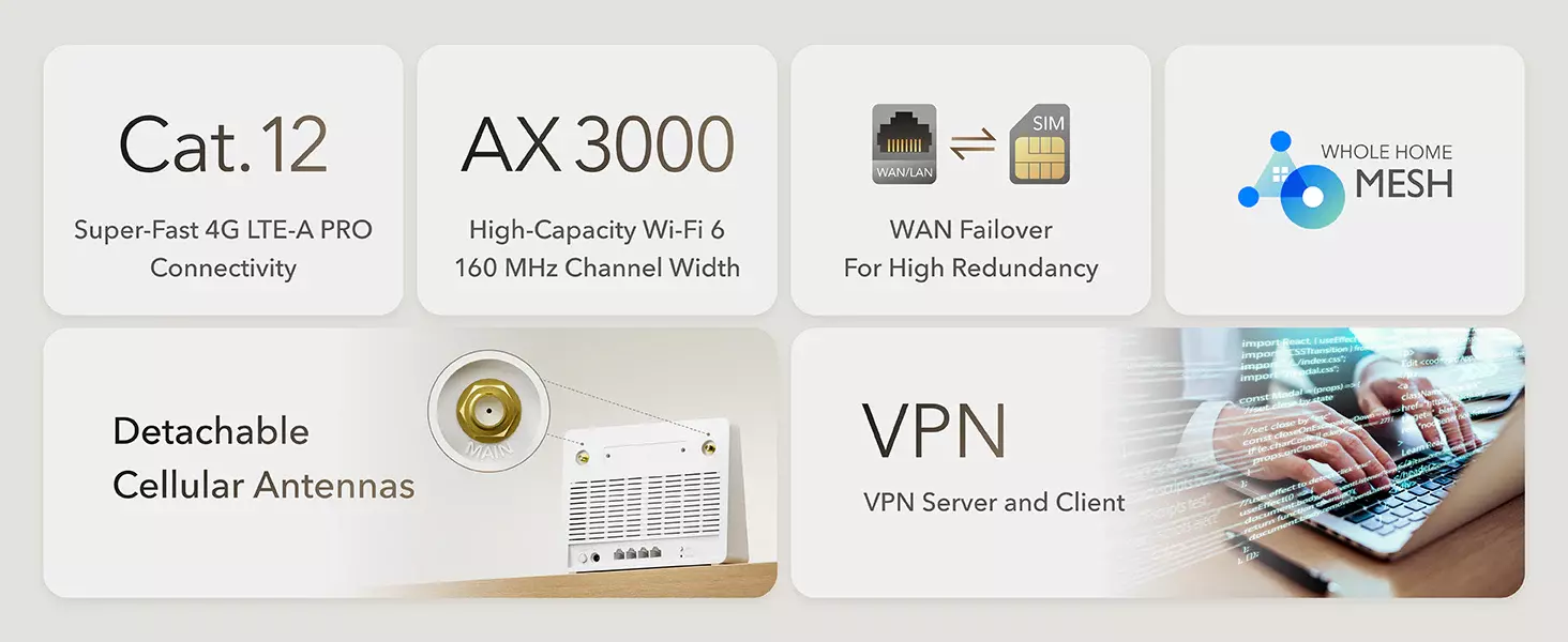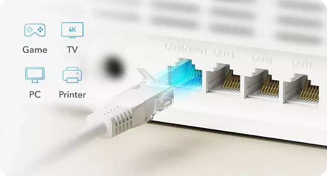 Share a wired network capable of speeds up to 1,000 Mbps, providing a high-bandwidth backbone, especially for NAS and creative PCs. The LAN/WAN port can be configured as a WAN port, connecting to another ISP and enabling WAN failover if the SIM card is also utilized.