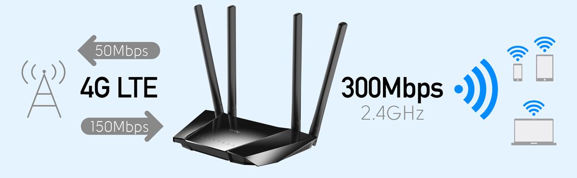 LT400 uses the latest generation of 4G LTE technology to achieve speeds of up to 150 Mbps when downloading and 50 Mbps when uploading. You can also connect to games, streaming and more using Wi-Fi at a maximum speed of 300 Mbps to 2.4 GHz.
