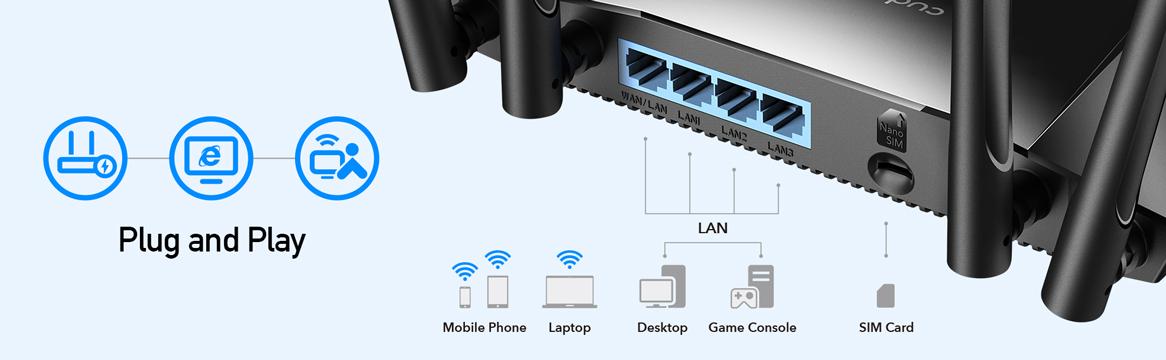 | If you are working in LAN mode, LT400 is just a normal 4G LTE router. While working in WAN mode, the LT400 can maintain 4G and WAN connections at the same time and preferably provide the Internet via wired ports. The 4G network is just a backup. | LT400 uses the latest generation of 4G LTE technology to achieve speeds of up to 150Mbps when downloading and 50Mbps when uploading. You can also connect to games, streaming and more using Wi-Fi at a maximum speed of 300Mbps to 2.4GHz. | Insert the SIM card (switch on) and enjoy the Internet! It is very easy to use when you are on vacation. Take it to your holiday home and enjoy surfing online. |