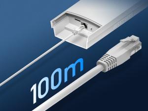Plug your Ethernet cable into the PoE adapter/switch to get up to 100 m of wired network reach. The extra cable is not included in the box.