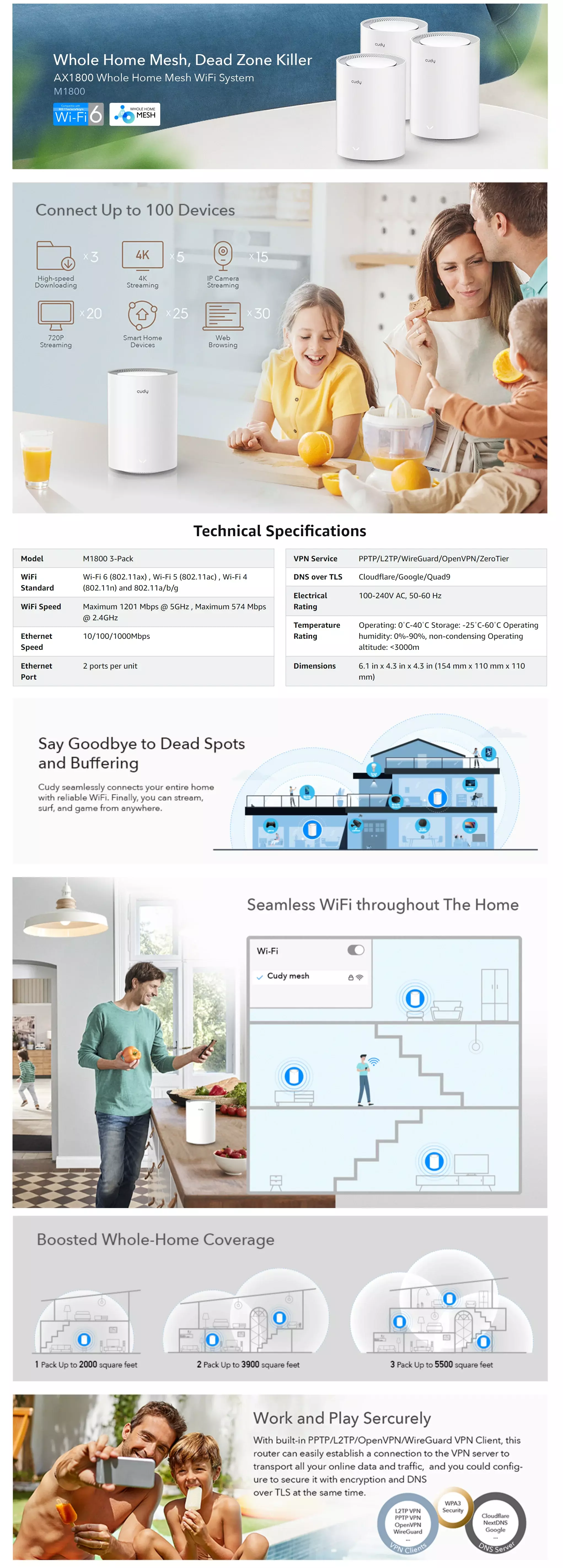 | Ethernet Notes | Port 1 as default WAN port, both as LAN ports on Mesh satellite units | Power Input | DC Jack |