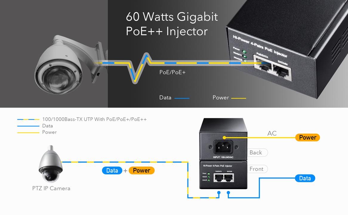 Pin Assignment and Polarity: 1/2 (-), 3/6 (+),4/5 (+), 7/8 (-), Output Power Voltage: 53Vdc User Port Power: 60W |