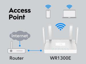 Turns wired connection into wireless. Usually, it is behind a router and doesn't has a DHCP server.