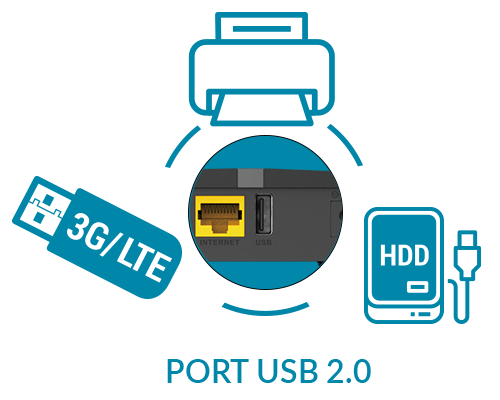 Built-in USB 2.0 port allows you to connect and share printers or hard disk. The hard disk is available to all users connected to the network, and the USB printer can be converted into a network printer to which everyone connected to the Wi-Fi network has access.
