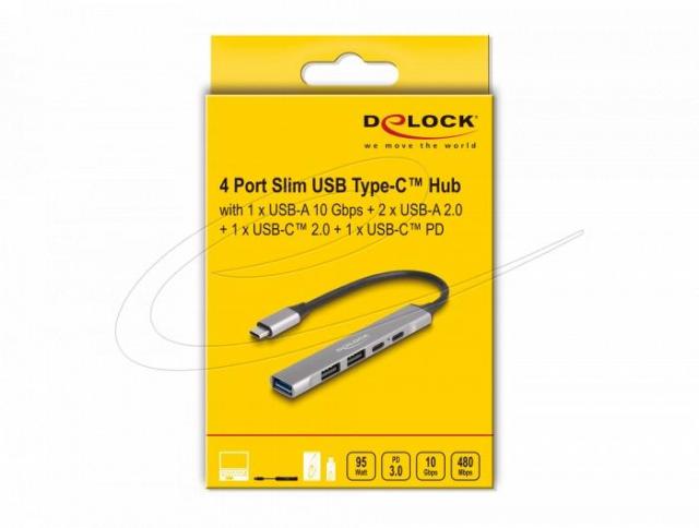 Delock Хъб USB-C, 4 порта, 1 x USB-A 10 Gbps, 2 x USB-A, 1 x USB-C, USB-C PD 95 W