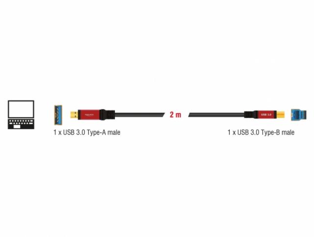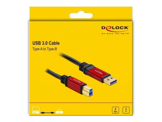 Кабел Delock USB-A мъжко - USB-B мъжко, 2 м, Premium, Екраниран, Черен