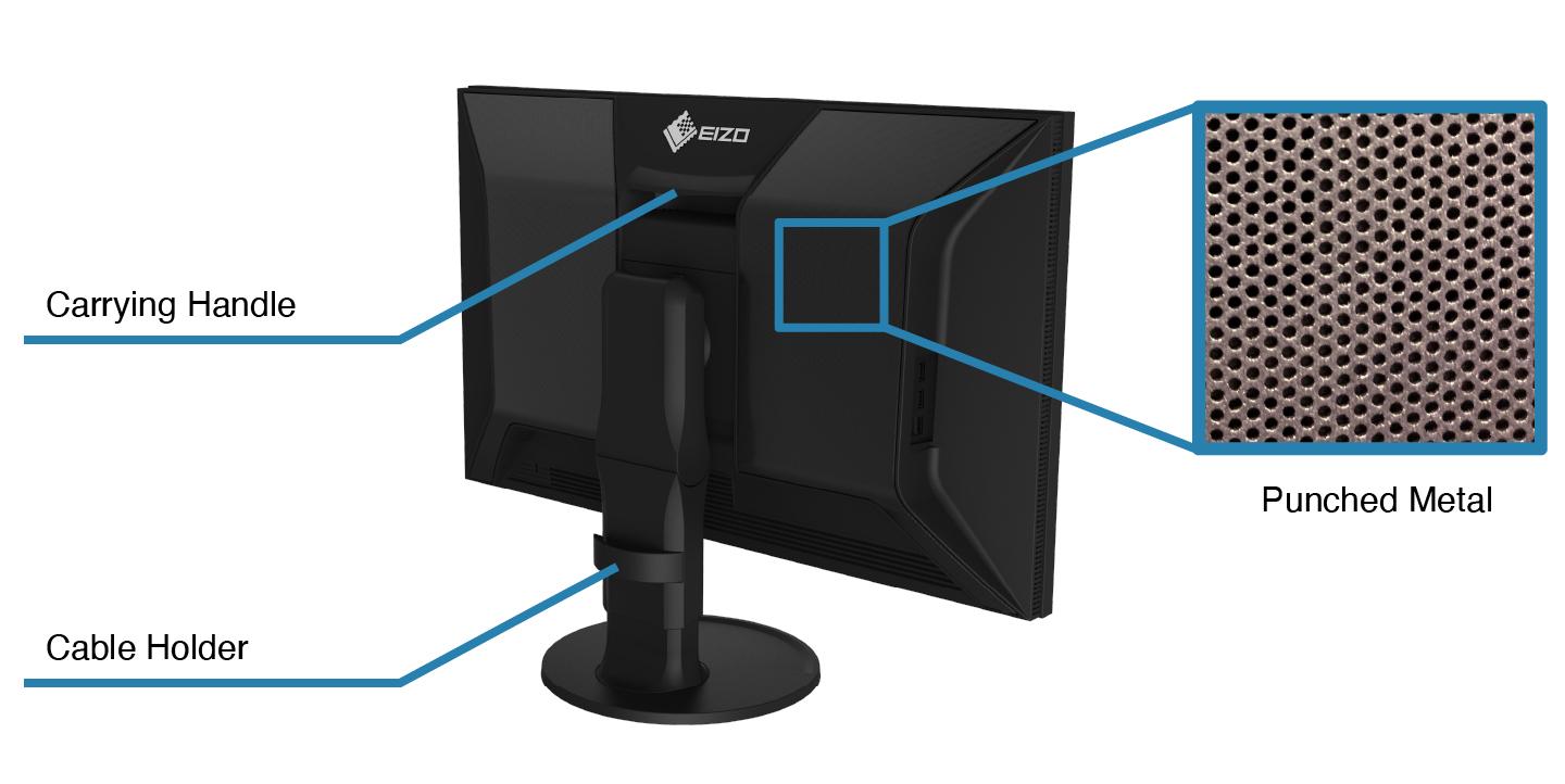 The ColorEdge CG2700X's sleek, new design incorporates punched metal on the back side that allows for more airflow, keeping the monitor cool without a noisy fan. A carrying handle on the back of the monitor allows you to easily move it to other locations.