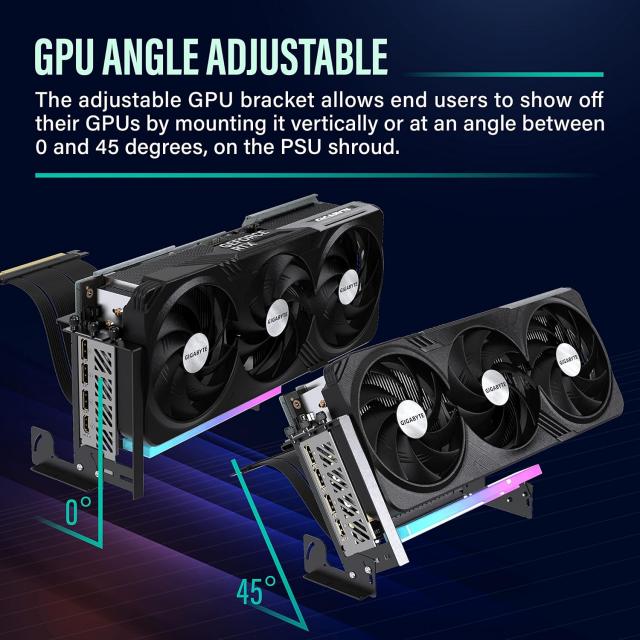 • Регулируемата скоба за GPU позволява монтаж на графични процесори и да подобрят ефективността на охлаждане, като я монтират вертикално или под ъгъл между 0 и 45 градуса във вашата кутия.