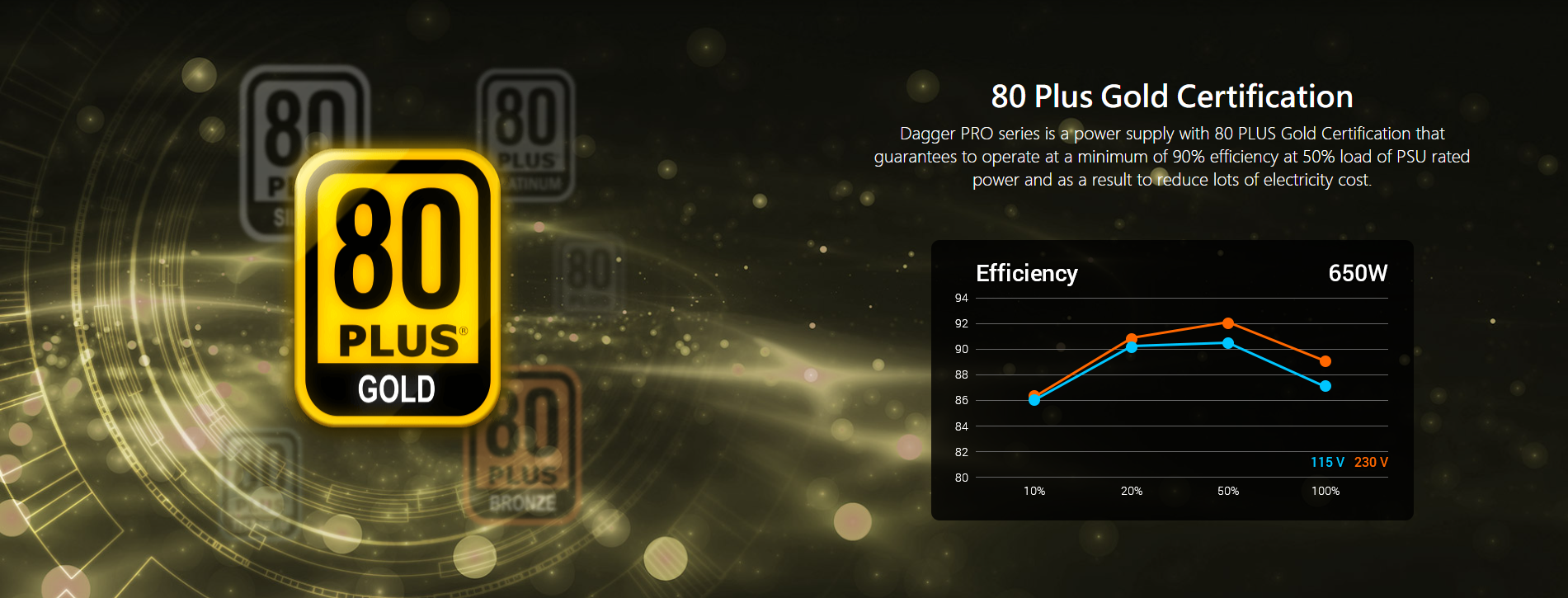 Supports High-end MotherboardFor gaming enthusiast, the DAGGER PRO 650W features dual CPU power connectors to support high-end motherboard and and provide stable power to the CPU for gaming enthusiast. |