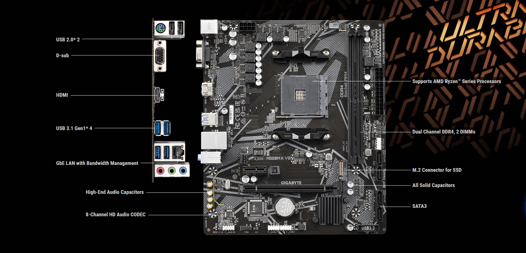 Дънна платка GIGABYTE A520M K V2, Socket AM4, mATX, 2xDDR4, M.2 NVMe
