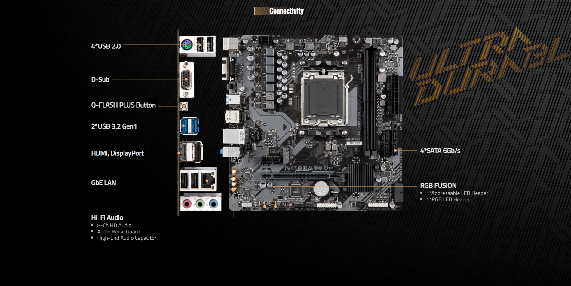 | Back Panel Connectors | 4 x USB 2.0/1.1 ports 1 x PS/2 keyboard/mouse port 1 x D-Sub port 1 x Q-Flash Plus button 2 x USB 3.2 Gen 1 ports 1 x DisplayPort 1 x HDMI port 1 x RJ-45 port 3 x audio jacks |