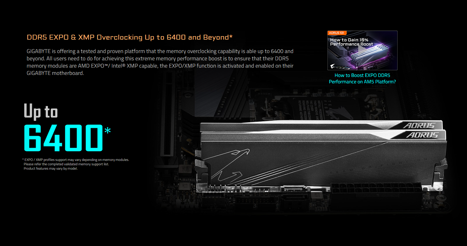 | Memory | Support for DDR5 6400(OC) / 6200(OC) / 6000(OC) / 5600(OC) / 5200 / 4800 / 4400 MT/s memory modules 2 x DDR5 DIMM sockets supporting up to 96 GB (48 GB single DIMM capacity) of system memory Dual channel memory architecture Support for non-ECC Un-buffered DIMM 1Rx8/2Rx8/1Rx16 memory modules Support for AMD EXtended Profiles for Overclocking (AMD EXPO) and Extreme Memory Profile (XMP) memory modules (The CPU and memory configuration may affect the supported memory types, data rate (speed), and number of DRAM modules, please refer to "Memory Support List" for more information.) |