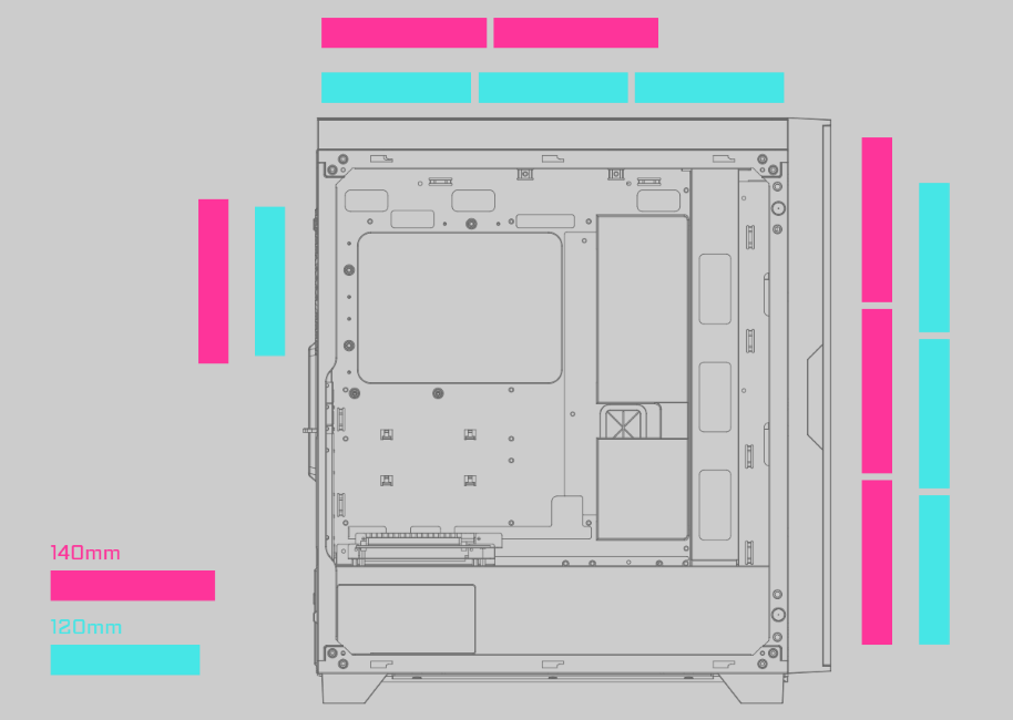 | Fan Support | Front : 120mm x3 / 140mm x3 Top : 120mm x3 / 140mm x2 Rear : 120mm x1 / 140mm x1 |