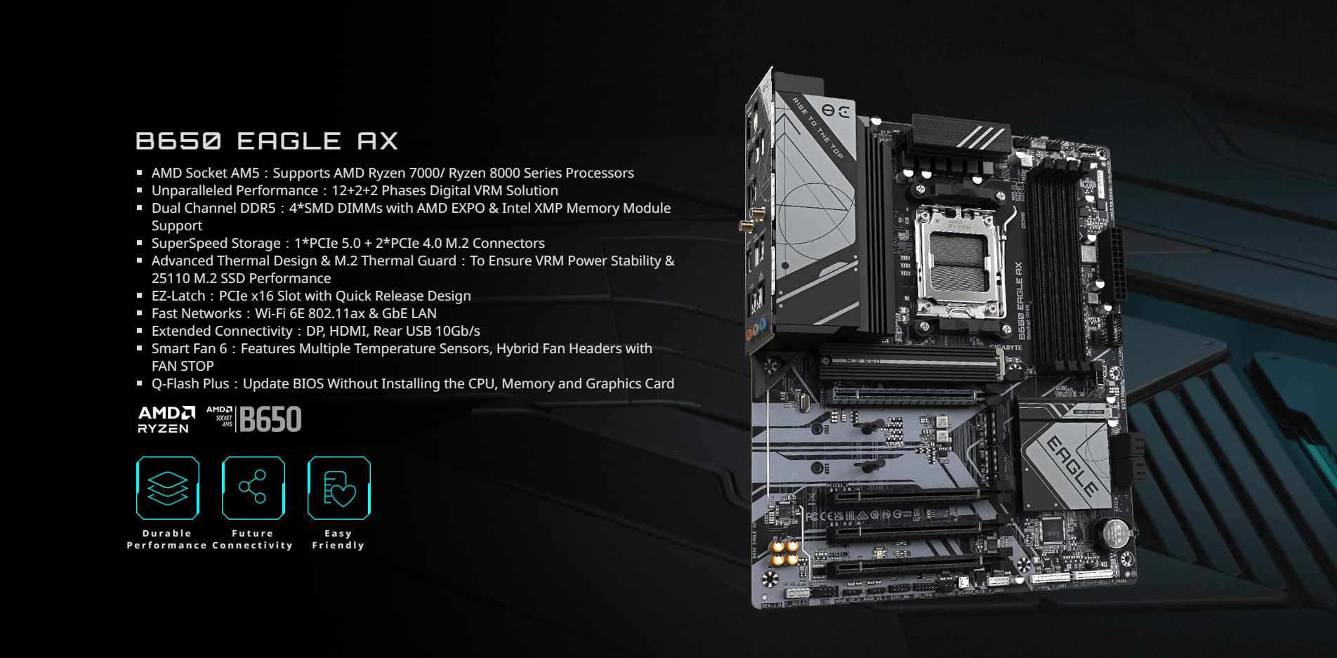 Дънна платка GIGABYTE B650 EAGLE AX, Socket AM5, WiFi 6E, DDR5