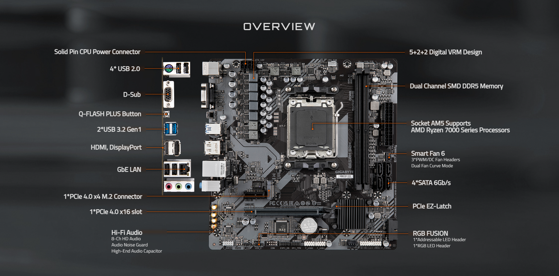 | CPU | AMD Socket AM5, support for: AMD Ryzen 7000 Series Processors (Go to GIGABYTE's website for the latest CPU support list.) |