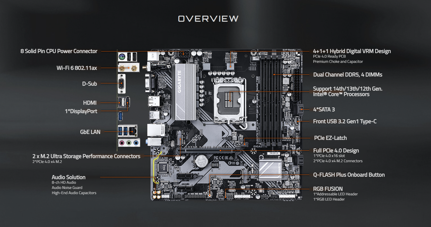 - Support for DDR5 5600/5200/4800/4400 MT/s memory modules 13th Generation Intel Core i5/i3 and 12th Generation Intel Core, Pentium Gold and Celeron Processors: - Support for DDR5 4800/4400 MT/s memory modules 4 x DDR5 DIMM sockets supporting up to 192 GB (48 GB single DIMM capacity) of system memory Dual channel memory architecture Support for ECC Un-buffered DIMM 1Rx8/2Rx8 memory modules (operate in non-ECC mode) Support for non-ECC Un-buffered DIMM 1Rx8/2Rx8/1Rx16 memory modules Support for Extreme Memory Profile (XMP) memory modules (The CPU and memory configuration may affect the supported memory types, data rate (speed), and number of DRAM modules, please refer to "Memory Support List" on GIGABYTE's website for more information.) |