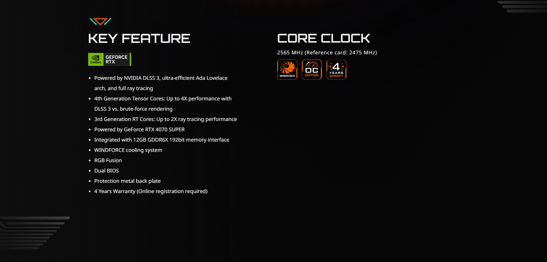 | Core Clock | 2565 MHz (Reference Card: 2475 MHz) | Card size | L=300 W=130 H=57.6 mm |