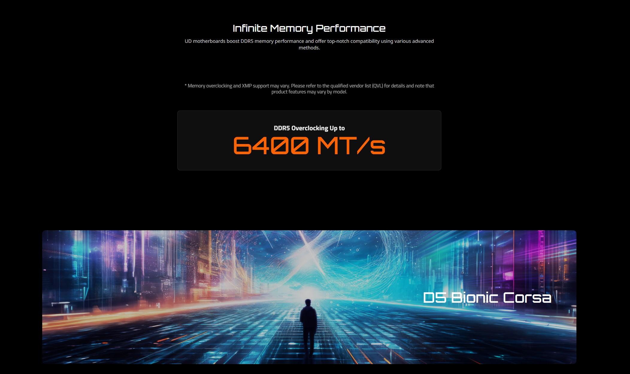 | Memory | Support for DDR5 6400/6200/6000/5800/5600 MT/s memory modules 4 x DDR5 DIMM sockets supporting up to 256 GB (64 GB single DIMM capacity) of system memory Dual channel memory architecture Support for ECC Un-buffered DIMM 1Rx8/2Rx8 memory modules (operate in non-ECC mode) Support for non-ECC Un-buffered DIMM 1Rx8/2Rx8/1Rx16 memory modules Support for Extreme Memory Profile (XMP) memory modules (The CPU andmemory configurationmay affect the supportedmemory types, data rate (speed), and number of DRAM modules, please refer to "Memory Support List" on GIGABYTE's website for more information.) |
