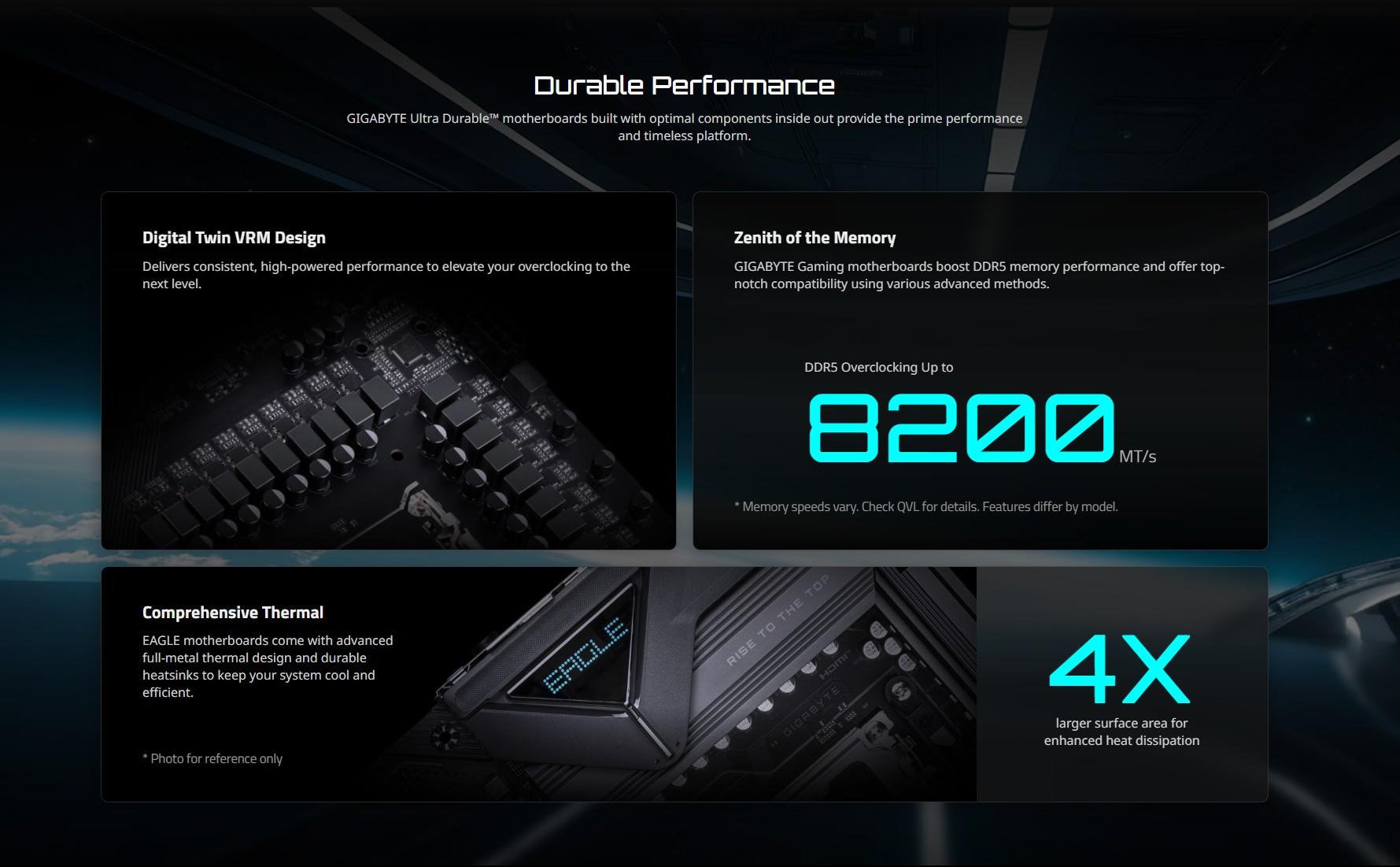 Support for DDR5 8200(O.C) / 8000(O.C) / 7950(O.C) / 7900(O.C) / 7800(O.C) / 7600(O.C.) / 7400(O.C.) / 7200(O.C.) / 7000(O.C.) / 6800(O.C.) / 6600(O.C.) / 6400(O.C) / 6200(O.C) / 6000(O.C) / 5800(O.C) / 5600(O.C) / 5200 / 4800 / 4400 MT/s memory modules.