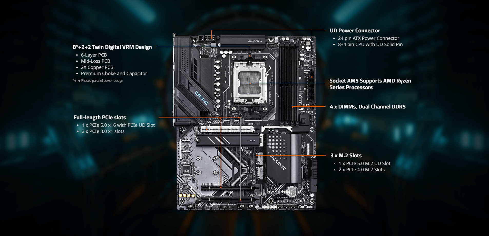 • AMD Socket AM5:Supports AMD Ryzen 9000 / 8000 / 7000 Series Processors