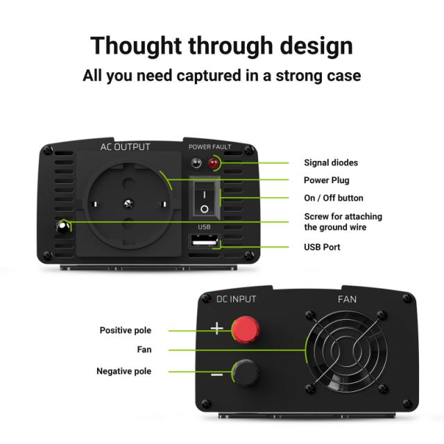Well-thought constructionThe device has been designed for the highest comfort of using. The front of the inverter is equipped with a main socket adapted to plugs used in Europe. It also has a USB port, thanks to which we can charge our smartphone, e-book reader or any other device that can be connected via a USB port. At the back of the inverter there is a fan ensuring proper cooling of the device. The whole was closed in a small,The whole was closed in a small, yet very durable casing. It is made of high quality aluminum, making it resistant to all mechanical damage and shock during travel. In addition, thanks to the materials used, the inverter is very light. |