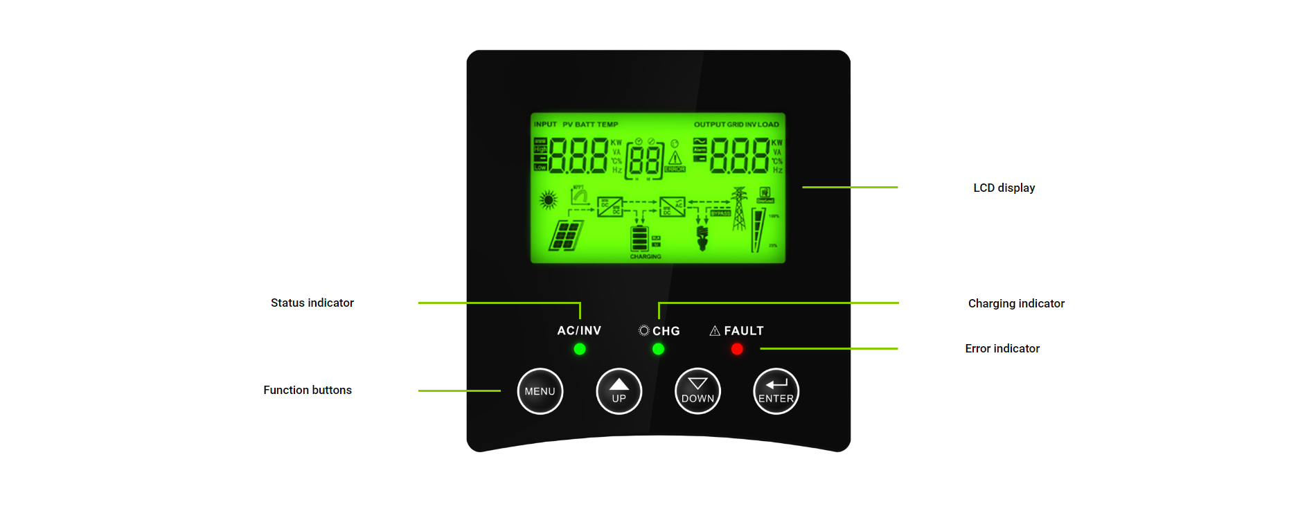 The Green Cell solar inverter is equipped with a readable, multifunctional LCD display that informs about the most important parameters of the inverter and allows you to adjust the settings to the needs of both the energy installation and the individual needs of the user.