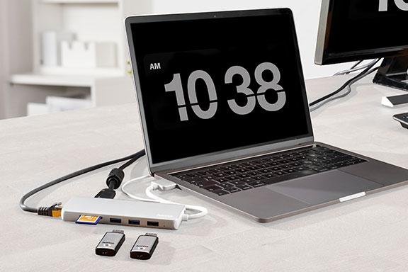 If you are rotating between different locations, it is enough to simply switch the multiport cable. For example, when moving from the office to the meeting room, where you spontaneously present your work to the team. Even if you're currently using all twelve ports, you only need to unplug one connector on your MacBook. In this way you avoid annoying cable clutter and at the same time ensure a professional and tidy work area.