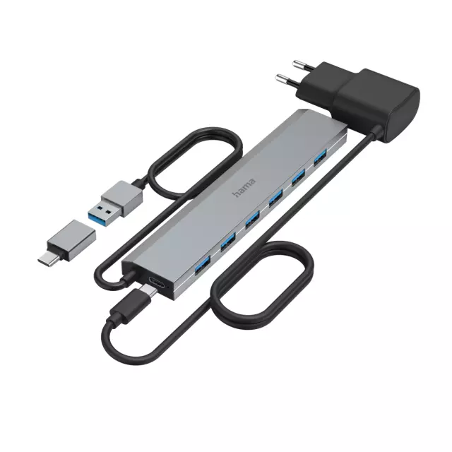 HAMA 7-портов хъб, USB 3.2 Gen 1, 5 Gbit/s, вкл. USB-C адаптер, авт.захранване