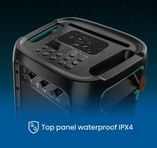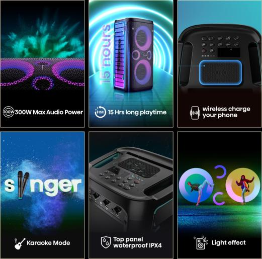 Мощна парти тонколона с 300W звук, дълъг живот на батерията, ефектно осветление и удобни екстри като караоке, безжично зареждане за телефон и устойчива конструкция за вътрешни и външни събития.