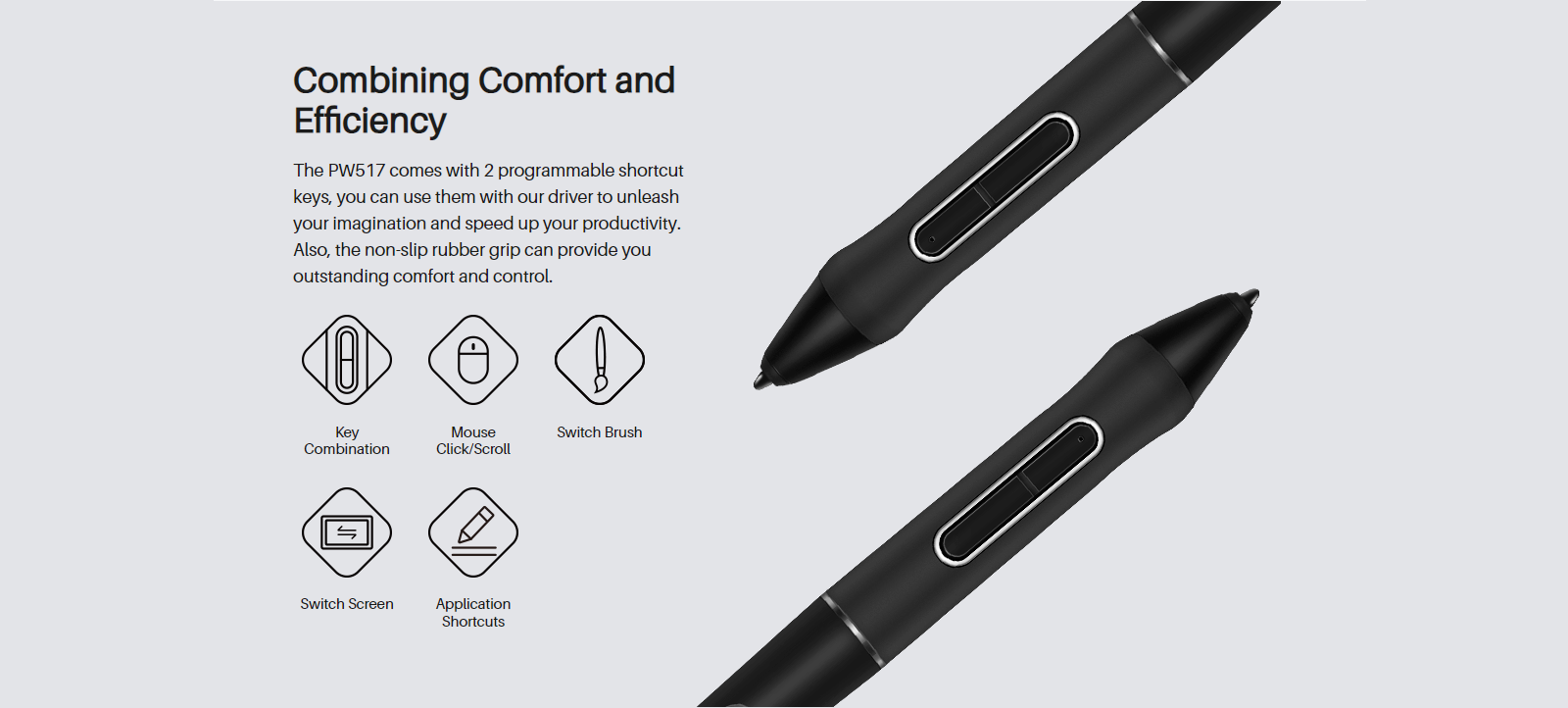 Battery-Free Pen PW517PenTech 3.0 TechnologyWith Huion PenTech 3.0 technology, the battery-free pen PW517 is optimized with a highly-sensitive and stable pen nib to ensure a more lifelike drawing experience as you′re using a regular ballpoint pen. |