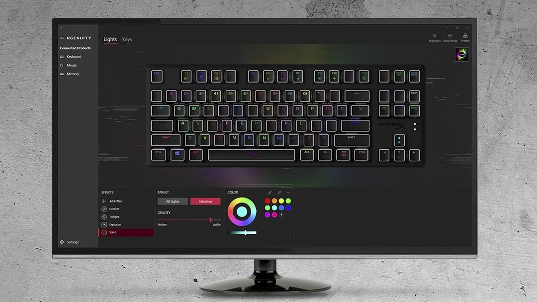 Customize your lighting, craft macros, and adjust Game Mode with HyperX NGENUITY Software. This powerful, yet easy-to-use program lets you set per-key lighting, layer dazzling lighting effects, and add scores of other personalized touches to your NGENUITY-compatible products.