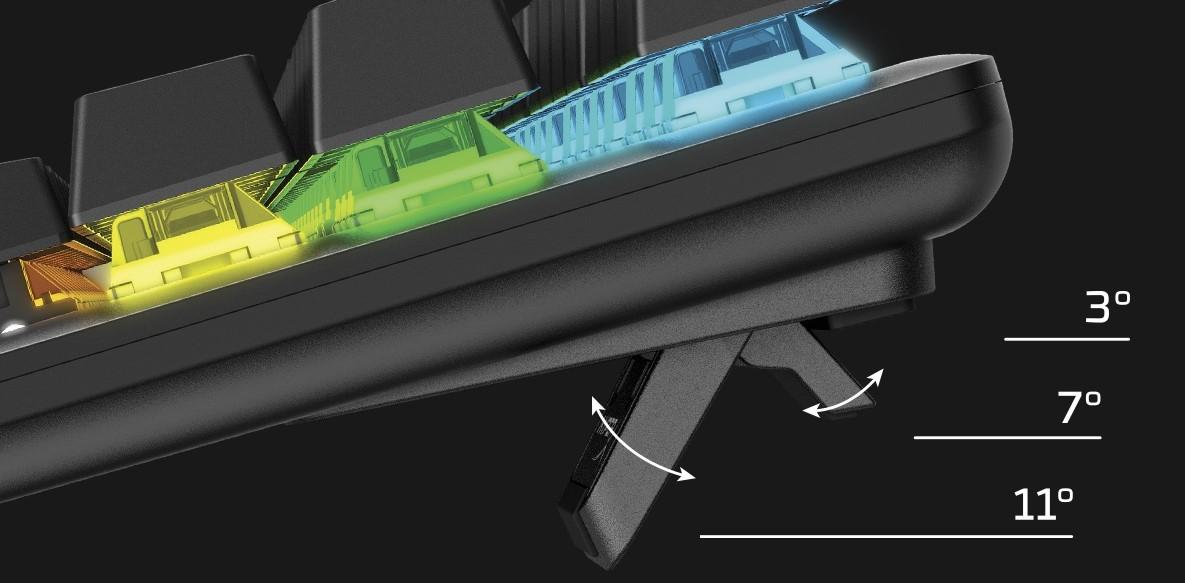 Adjust the two-step keyboard feet for three different angle settings (3°, 7°, or 11°), whichever makes your wrists the most comfortable.