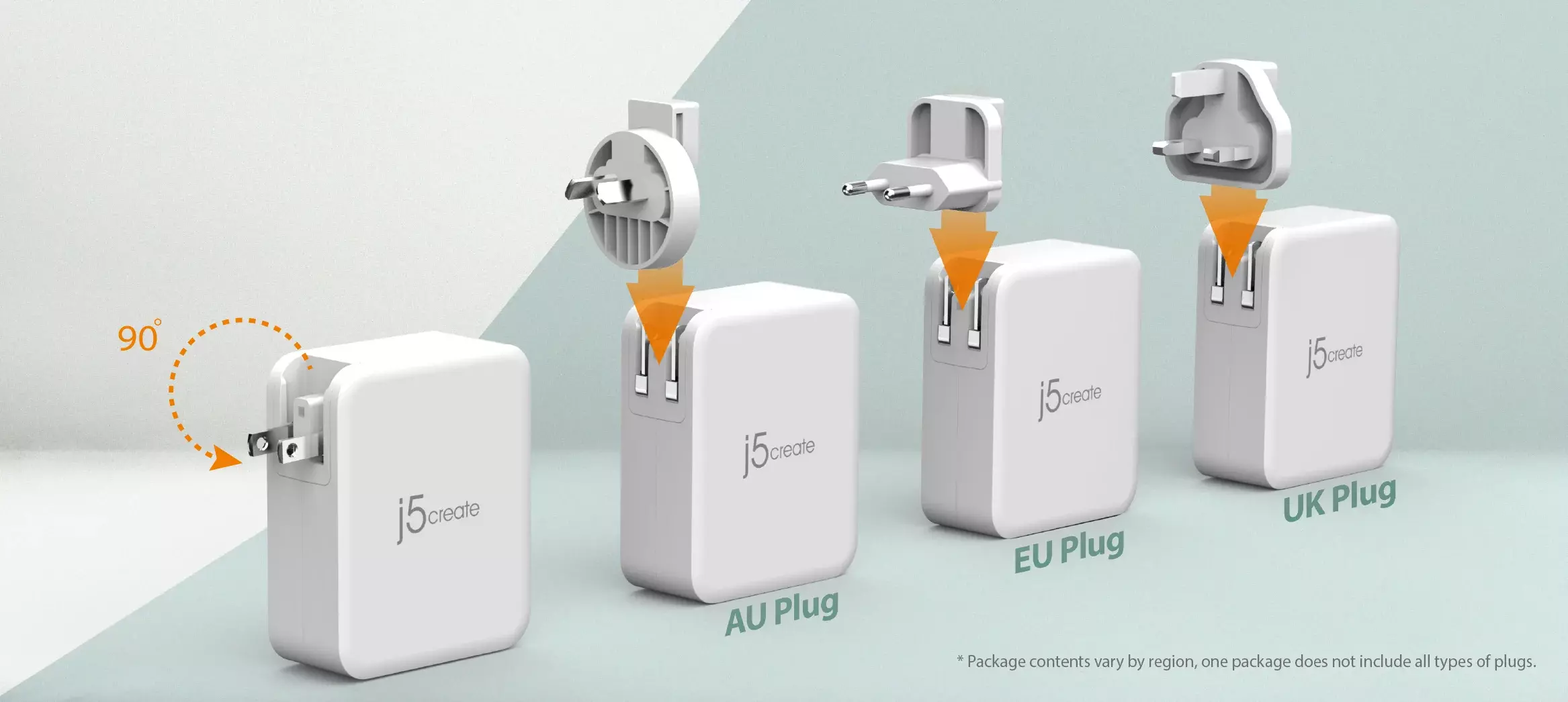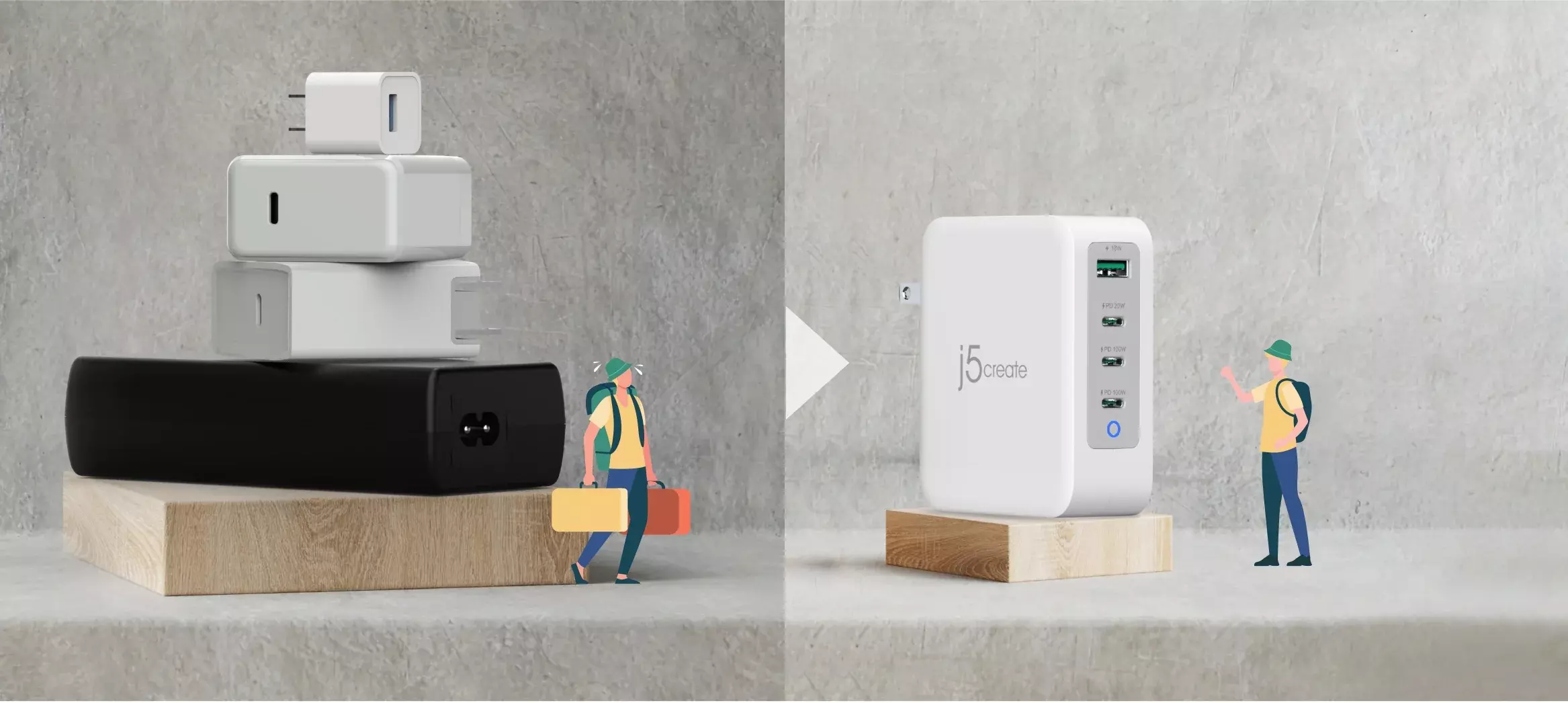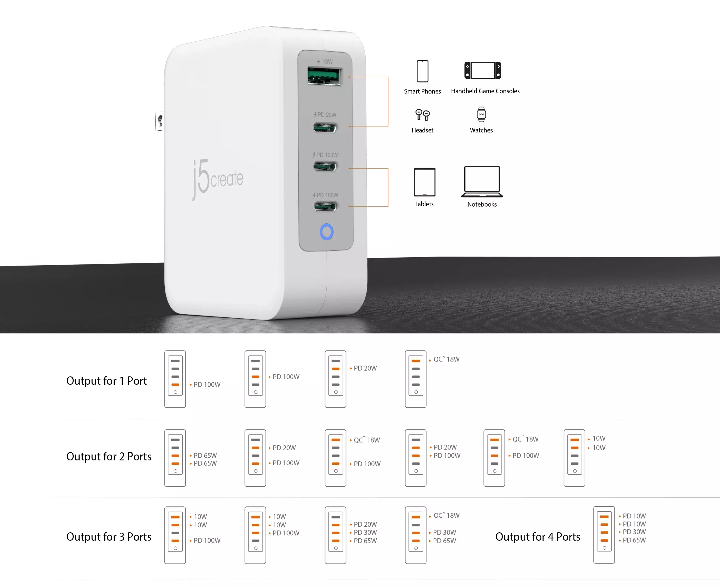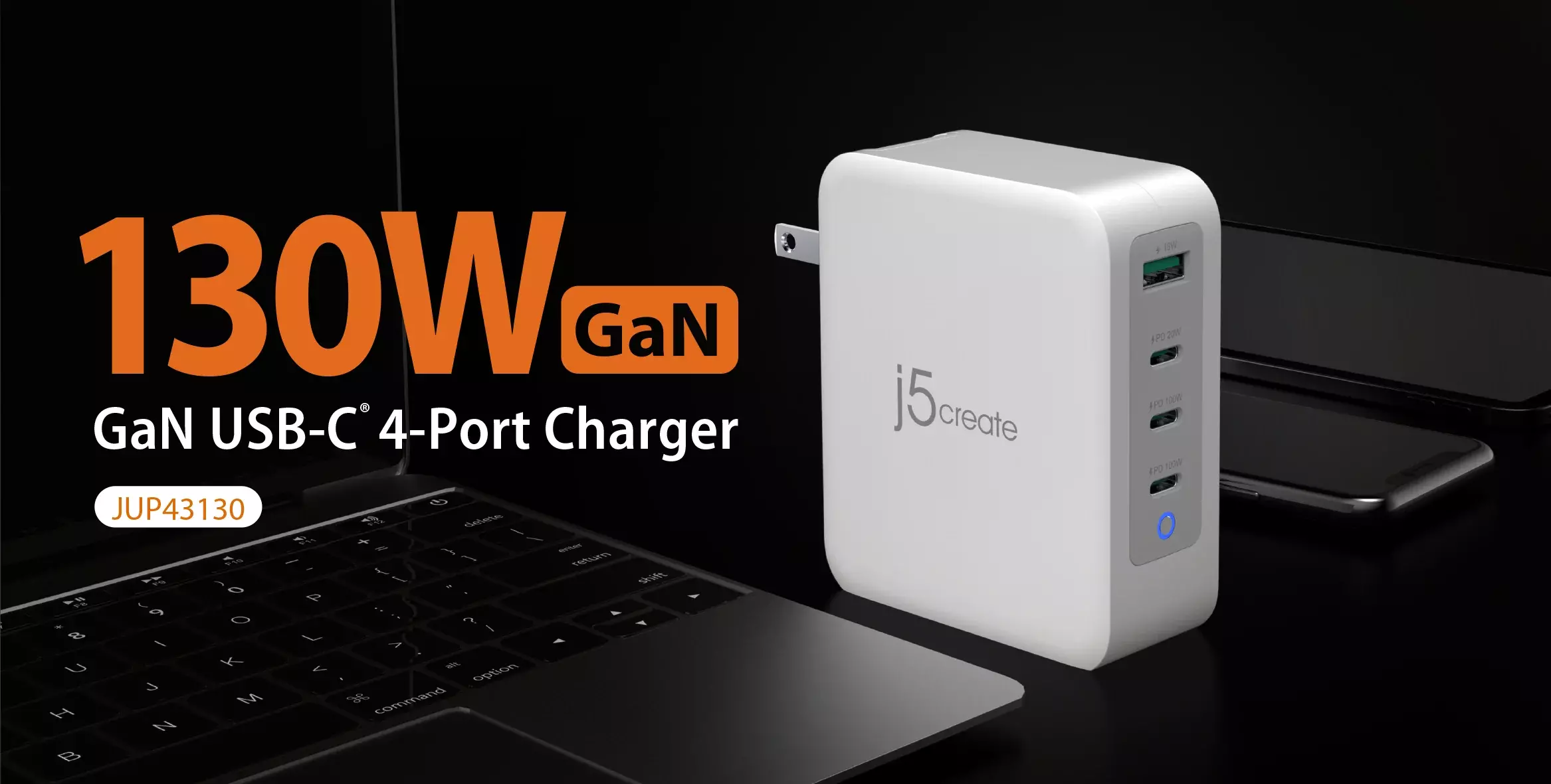 Мрежово зарядно j5create JUP43130E 130W, 4 порта, USB-C, USB-A