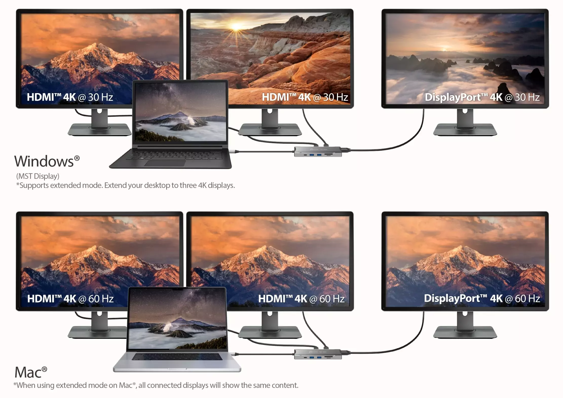 Create a dual or triple 4K workstation with two HDMI and a DisplayPort output on compatible USB-C laptops with DisplayPort 1.4 and Multi-Stream Transport (MST)