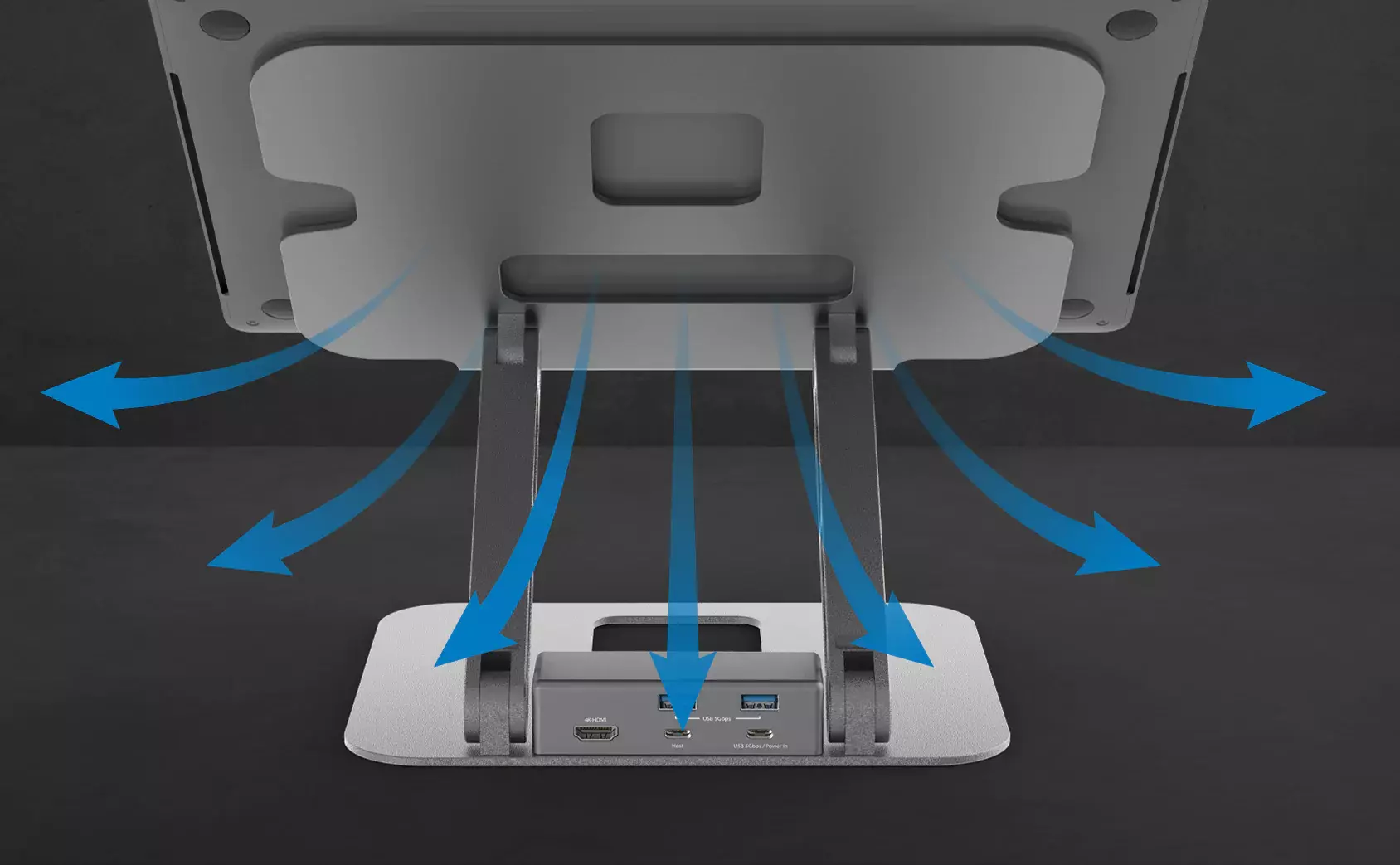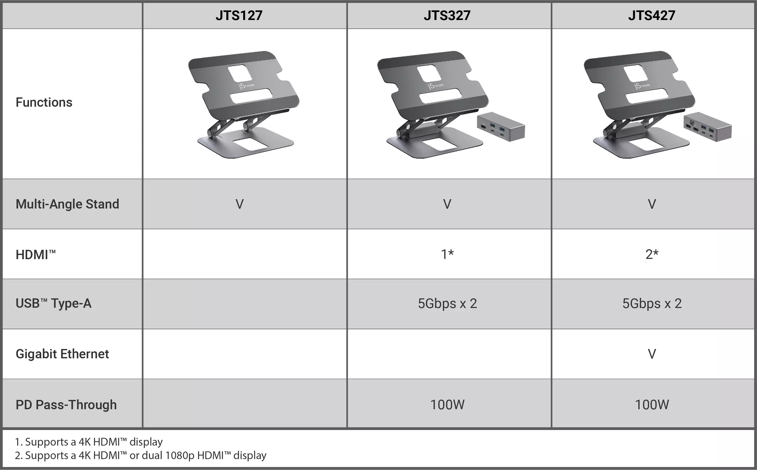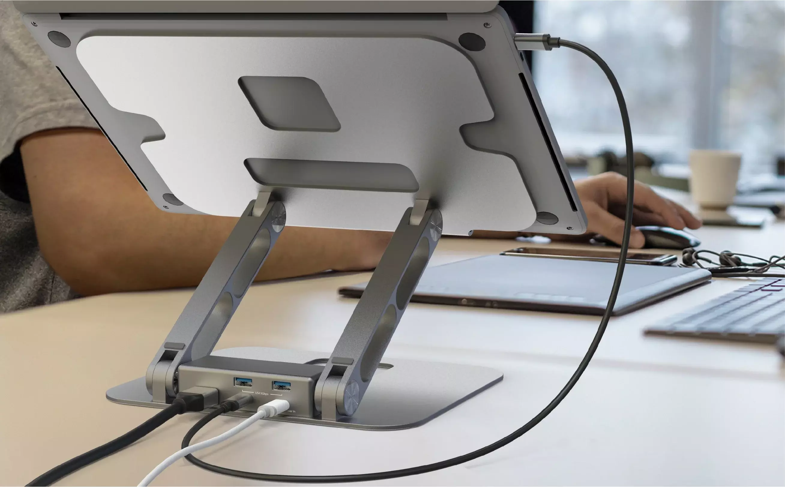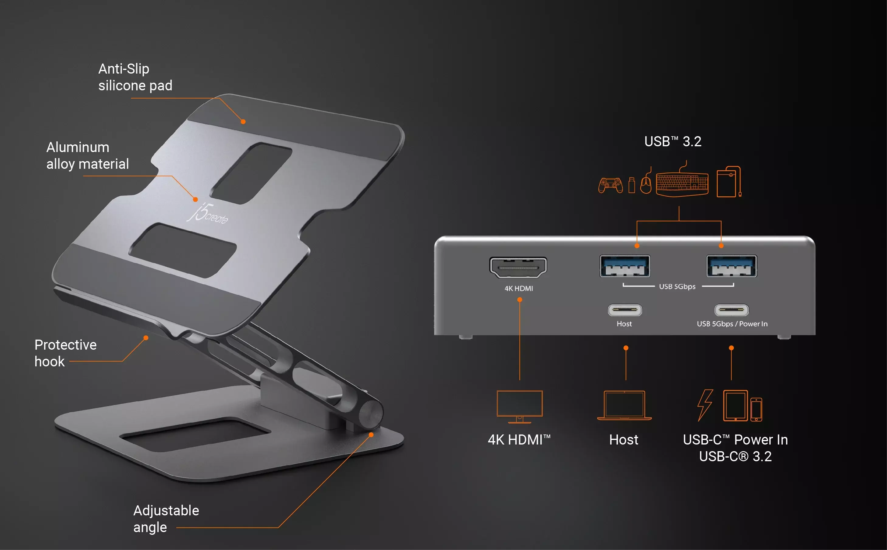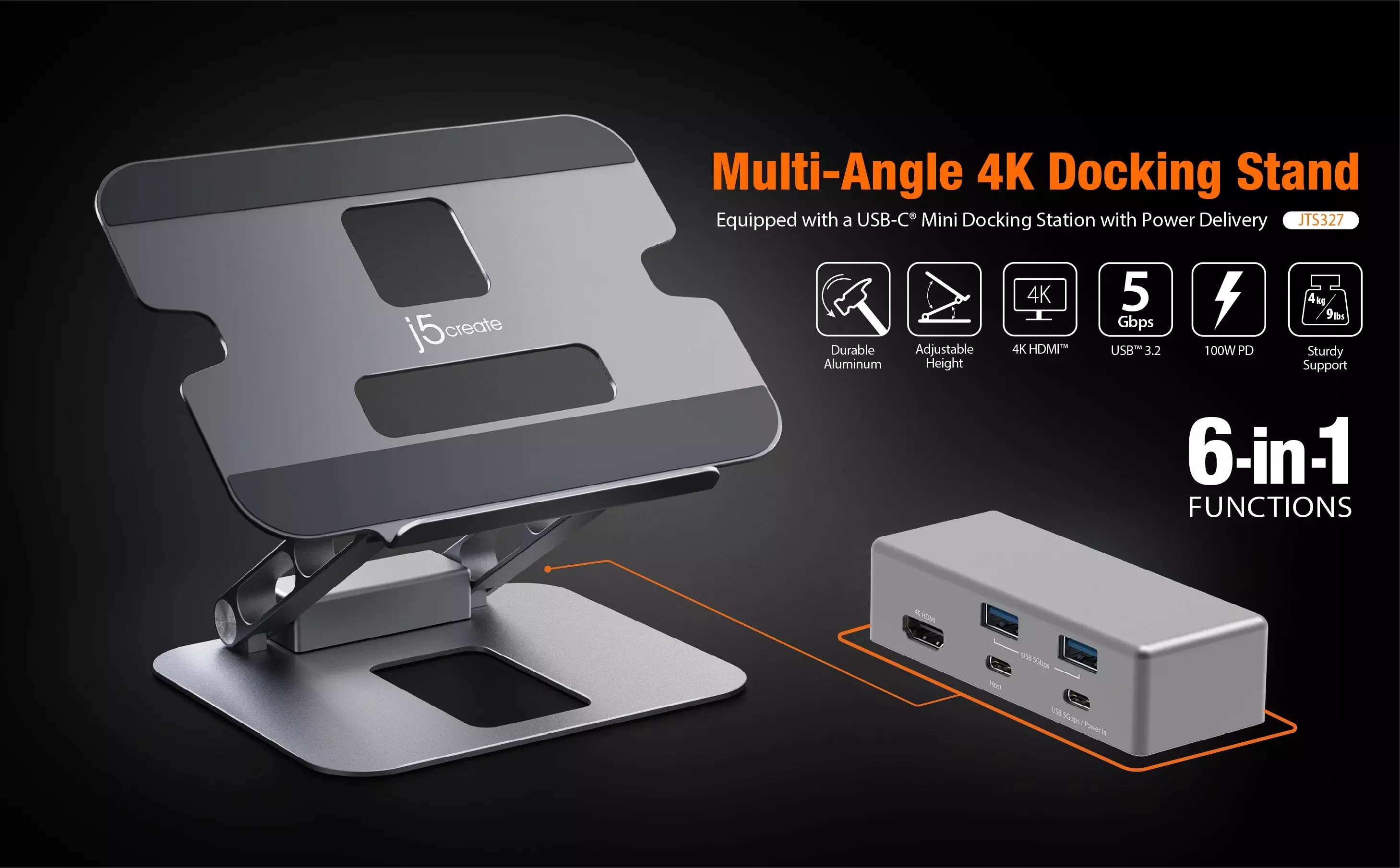 Поставка за лаптоп с докинг станция j5create JTS327, Регулеруема, до 16", USB-C, 4K