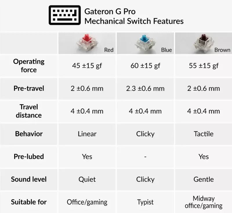 and 5pin mechanical switches on the market (including Gateron, Cherry, Kailh, etc.). SMD-LED compatible switches are the best