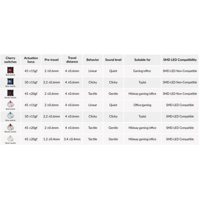 Cherry MX Switch is the most famous and branded switch series that will offer excellent, smooth and tactile typing experience. The Cherry MX switches are fully compatible with our K2, K4, K6 and K8 Wireless Keyboard Hot-swappable versions that do not require soldering. Cherry offers the popular and widely used switch technology for mechanical keyboard market. Cherry MX Switches and Cherry MX RGB Switches are available in several variants and the main three are Cherry MX Red, Blue and Brown. They successively deliver linear, click, and tactile style feedback. As pictures above shown, the normal Cherry MX and MX RGB switch both are plate mounted but the Cherry MX RGB switches has a transparent base/ housing for RGB compatibility, which is SMD-LED compatible. While the normal Cherry MX switch has jet black housing and the keyboard backlight does not shine through.