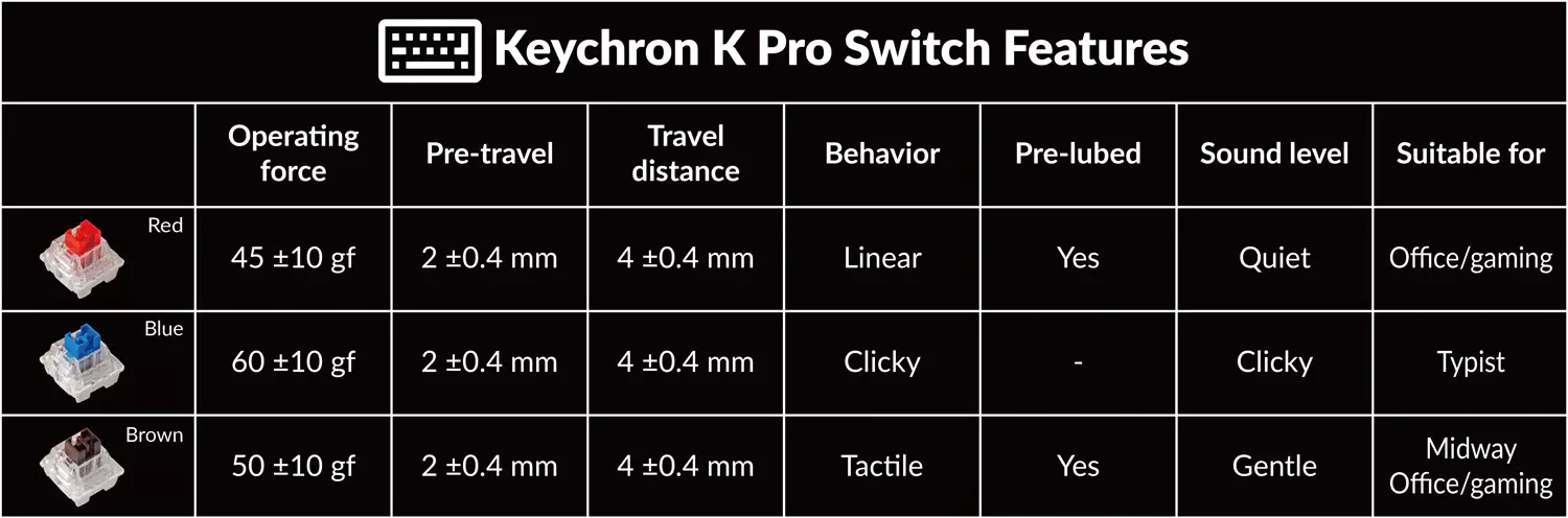 | Switches (Not including Barebone Version) | Keychron K Pro Mechanical | BT Working Time (RGB) | Up to 160 hours (Lowest brightness) |