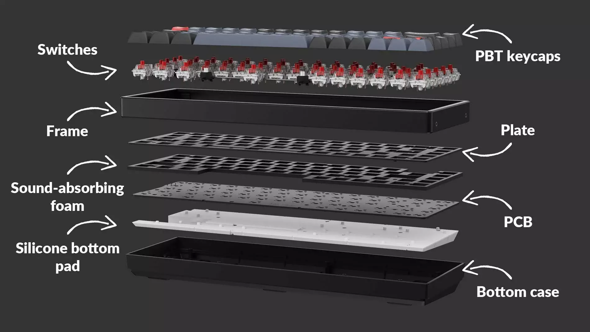 The K6 Pro has been re-engineered and redesigned from the inside out to upgrade the typing experience. The added sound-absorbing foam, a thick silicone dampening bottom pad, and steel plate provide responsive feedback and a peaceful typing sound, while added weight will enhance the stability.