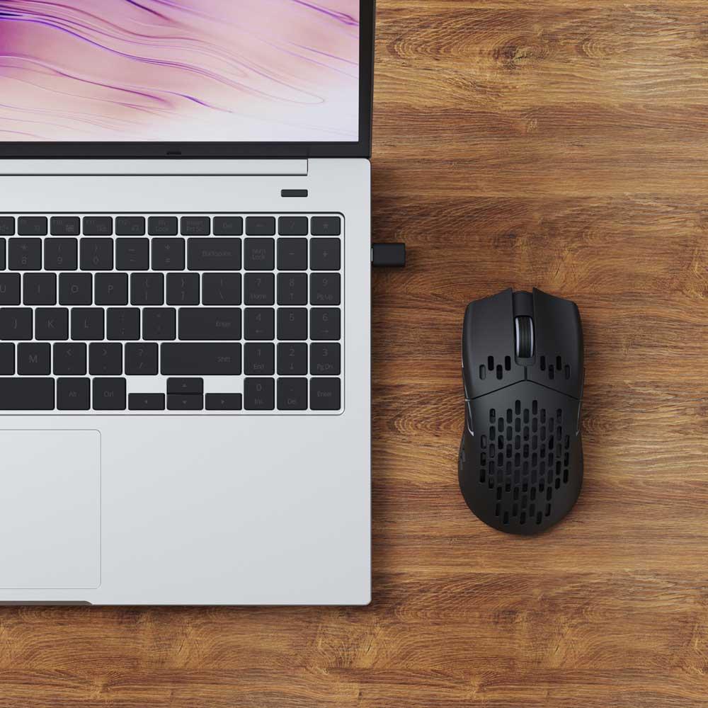 We designed the smallest Type-C 2.4 GHz receiver and a Type-A 2.4 GHz receiver for the mouse. You can pick either of them, plug it in, and play instantly.