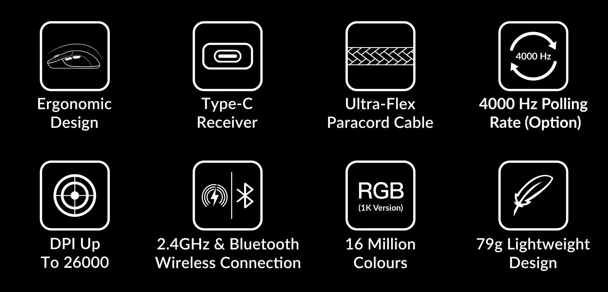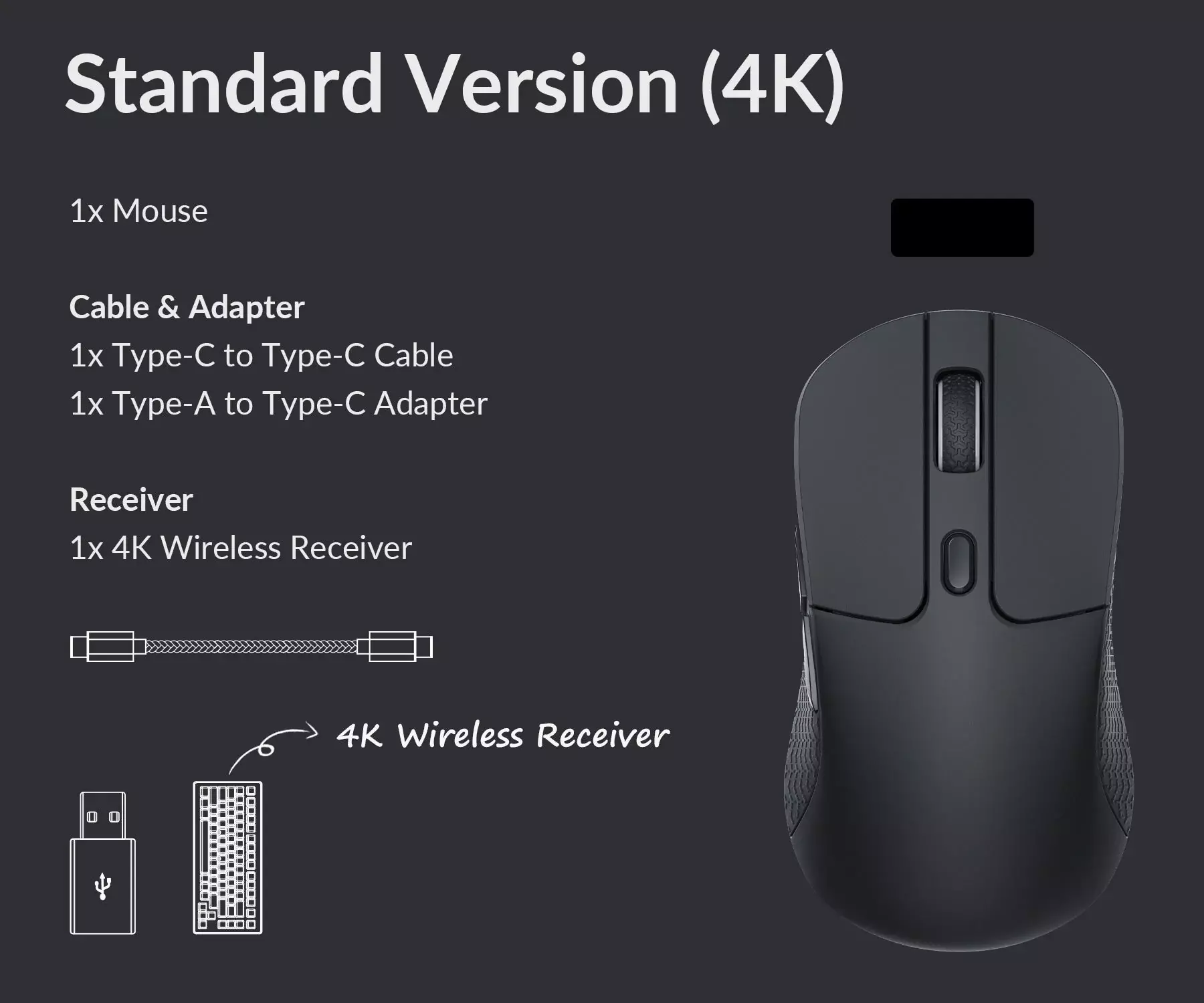 | Polling Rate | 4000 Hz (2.4 GHz mode) 1000 Hz (Wired mode) 125 Hz (Bluetooth mode) |