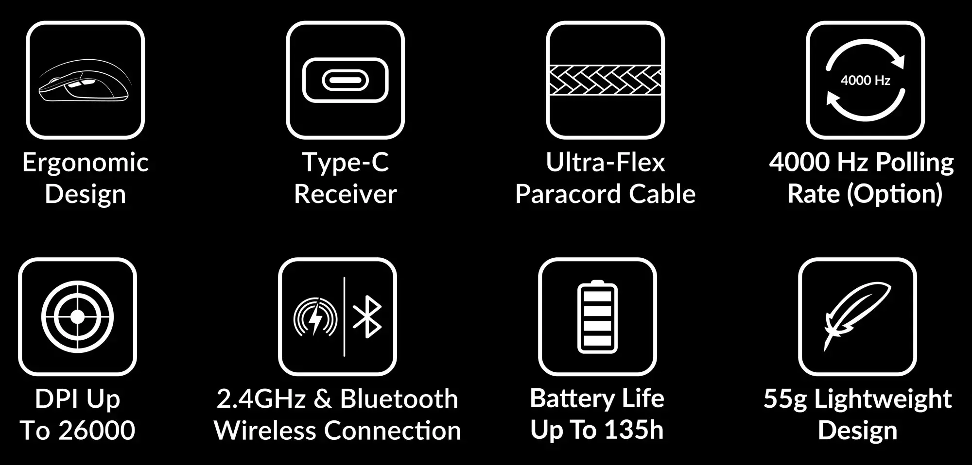 | DPI Range | 100 - 26000 | Cable | Detachable Type-C to Type-C Cable + Type-A to Type-C adapter |