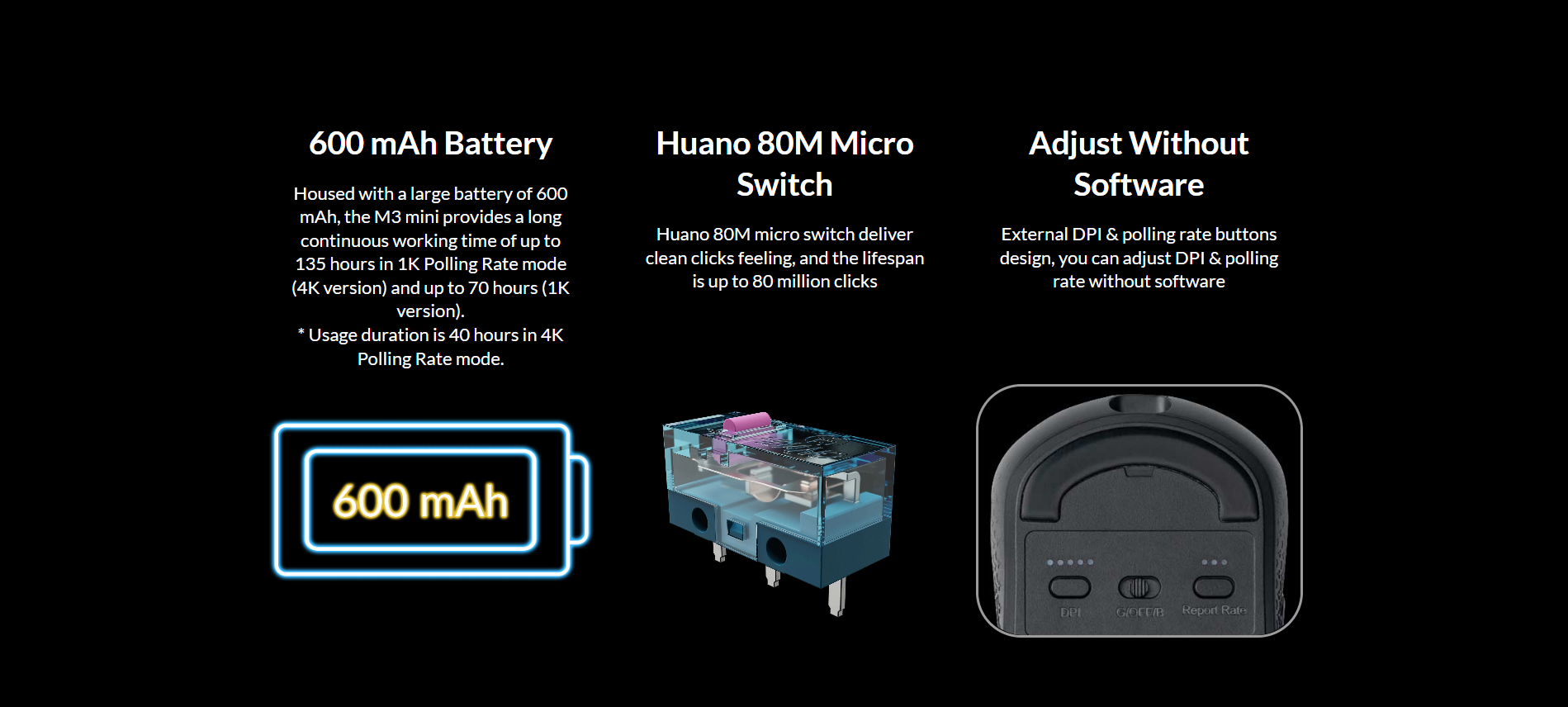 M3 mini has the strongest, most competitive grade mouse sensor chip PixArt 3395, with up to 26,000 DPI, up to 650 IPS, and incomparable gripping precision. Whether for work or gaming, it offers an unparalleled experience.