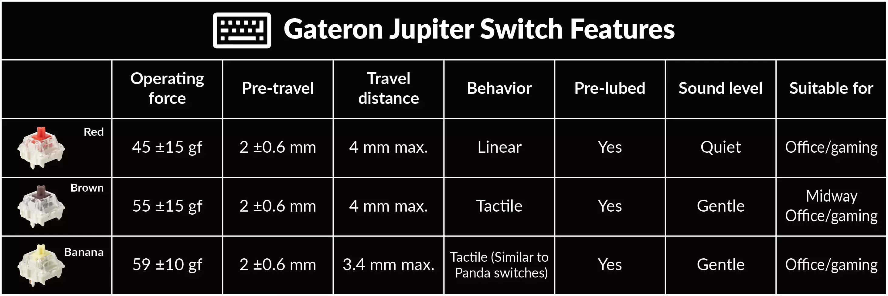 Our exclusive Gateron Jupiter mechanical switch (for the Fully Assembled version only) comes with a 3-pin design, its pre-lubed