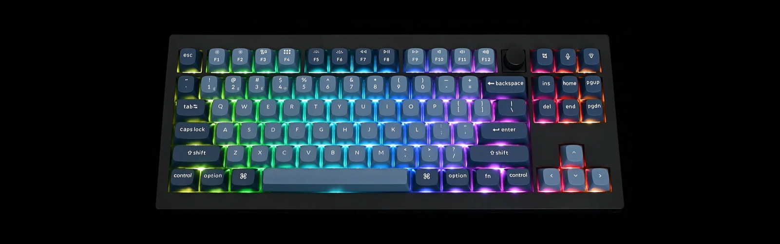 angle with the premium non-shine-through PBT keycaps installed. The south-facing RGB is also free
