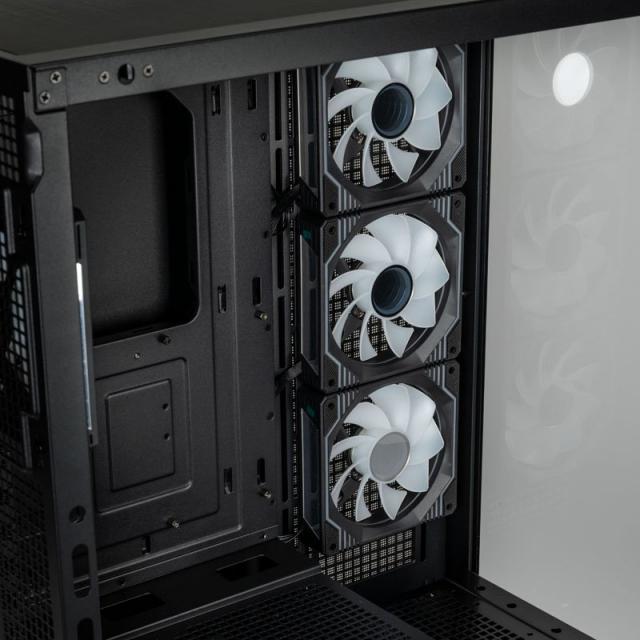За да поддържа вашия гейминг компютър хладен, Kolink Unity Arena разполага с обширна поддръжка за хардуер за въздушно и водно охлаждане. Четирите предварително инсталирани вентилатора са монтирани три отстрани, с обратен дизайн на лопатките за входящ въздух, и последният е поставен на задния панел за изходящ въздух. Освен това има обилна вентилация през цялото шаси, за да се улесни естественият въздушен поток.