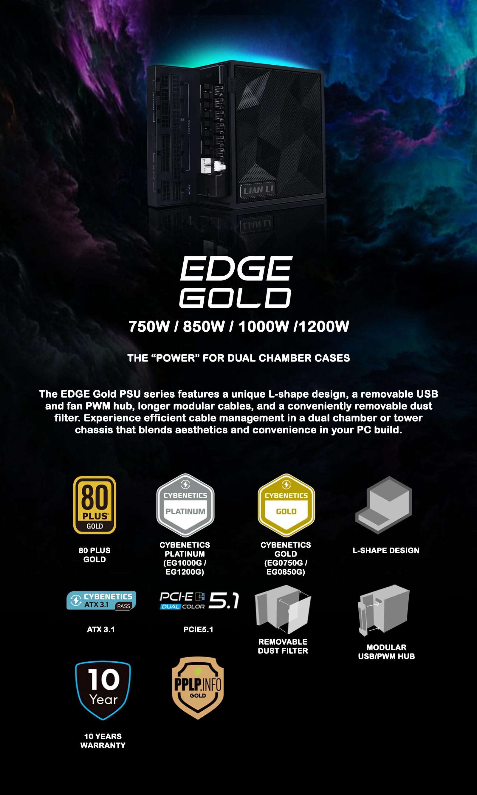 Lian Li EDGE EGO850 GOLD е висококачествен 850W модулнo захранваne с уникален L-образен дизайн, сертифициран по стандарта 80 PLUS Gold и съвместим с ATX 3.1 и PCIe 5.1.