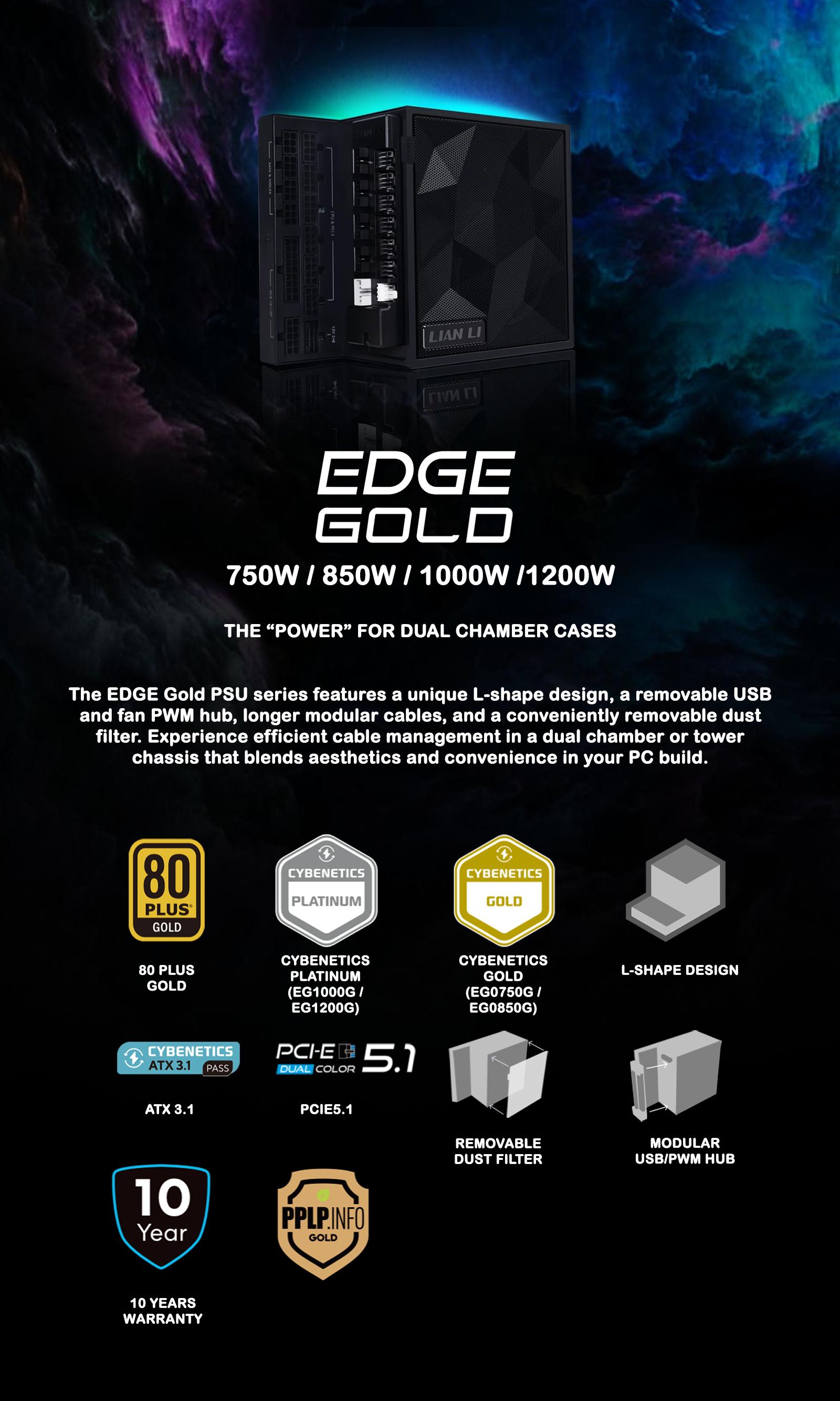Lian Li EDGE EGO850 GOLD е висококачествен 850W модулно захранване с уникален L-образен дизайн, сертифициран по стандарта 80 PLUS Gold и съвместим с ATX 3.1 и PCIe 5.1.
